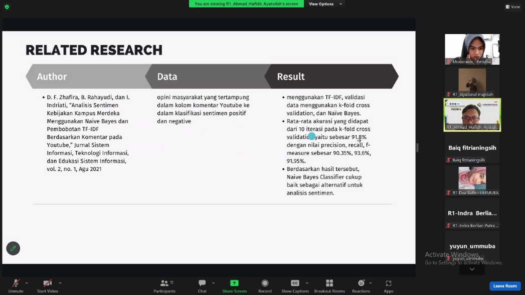 Sementara itu, Ahmad Hafidh Ayatullah, M.Kom, seorang dosen Informatika Medis UMLA dalam bidang Machine Learning, membahas tentang bagaimana AI dapat meningkatkan efisiensi layanan rumah sakit dengan melakukan analisis sentimen penilaian masyarakat menggunakan TF-IDF dan Naive Bayes.